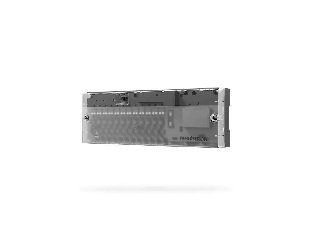 - Modul, jako nealarmový prvek, není vybaven sabotážním senzorem. U instalací s požadavkem plnění stupně zabezpečení 2 dle EN 50131 musí být pro ochranu sběrnice modul zapojen na vyhrazeném sběrnicovém výstupu ústředny nebo za oddělovačem sběrnice JA-110T.